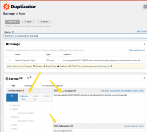 Take the default parameters for duplicator – with the following exceptions, a) there’s a main exclusion to not backup the wp-content/uploads folder, this stops the backup from pulling in all the club specific uploaded assets, we’ll cover this in the next step. B) note also the file type exclusions at the bottom right. c) – it’s just the database we’re backing up.